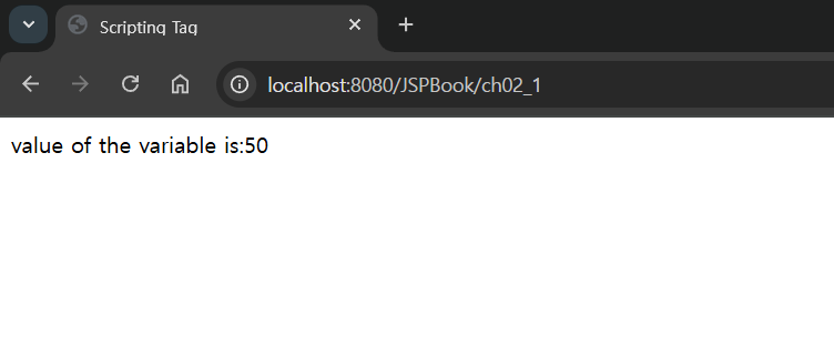 pageEncoding="UTF-8"%> <!DOCTYPE html> <html> <head> <meta charset="UTF-8"> <title>Scripting Tag</title> </head> <body> <%! int data = 50; //전역변수%> <% out.println("value of the variable is:" + data); //HTML에 출력(문자열) %> </body> </html> |