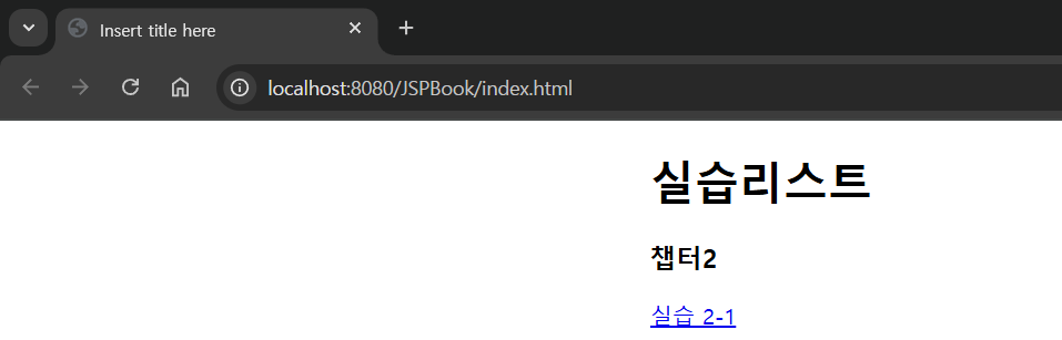 | 부록 | MVC패턴설정 | Step1 | index.html에 코드 삽입 | <a href="ch02_1">실습1</a>: ch02_1은 요청명이므로 제일 중요 예상 요청 URL: localhost:8080/JSPBook/ch02_1 |