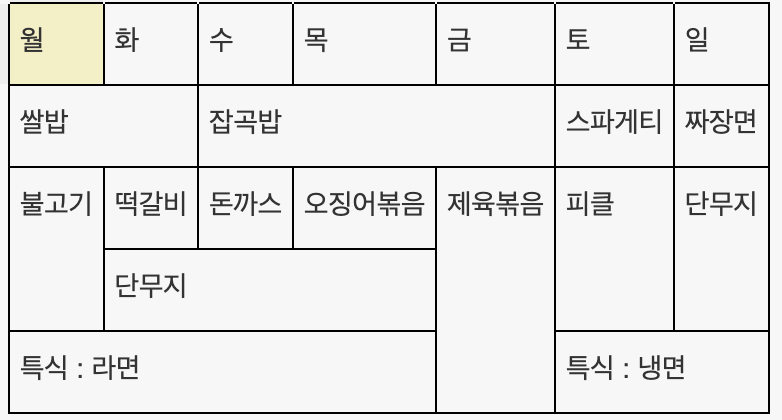 <td colspan="4">특식:라면</td>