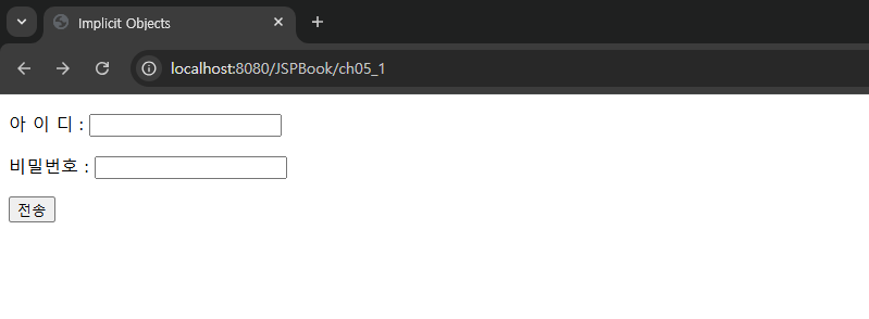 pageEncoding="UTF-8"%> <!DOCTYPE html> <html> <head> <meta charset="UTF-8"> <title>Implicit Objects</title> </head> <body> <form action="" method="post"> <p> 아 이 디 : <input type="text" name="id"> <p> 비밀번호 : <input type="text" name="password"> <p> <input type="submit" value="전송" /> </form> </body> </html> |