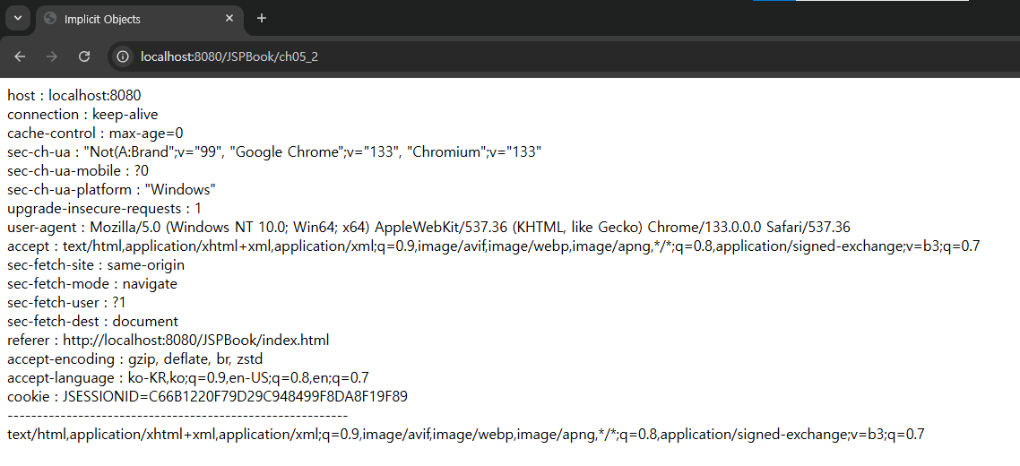 pageEncoding="UTF-8"%> <%@ page import="java.util.Enumeration" %> <!DOCTYPE html> <html> <head> <meta charset="UTF-8"> <title>Implicit Objects</title> </head> <body> <% 타입 keys Enumeration en = request.getHeaderNames(); while(en.hasMoreElements()){ -> 안에 있는 값을 모를 때 String headerName=(String) en.nextElement(); String headerValue=request.getHeader(headerName); %> <%=headerName %> : <%=headerValue %><br> <% } %> ----------------------------------------------------------<br> <% String headerValue = request.getHeader("accept"); %> <-값을 알 때 <%= headerValue %> </body> </html> |