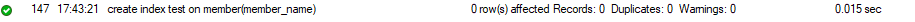 -다음 SQL을 실행하면 인덱스가 생성됨. 인덱스는 열에 지정함. SQL의 마지막에 On member(member)name)의 의미는 member 테이블의 member_name 열 인덱스를 지정하라는 의미임. 결과는 특별히 눈에 보이지 않음