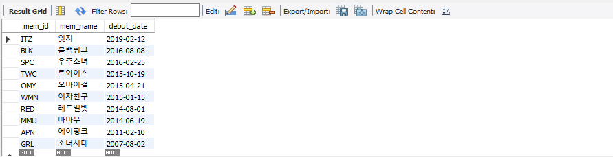 -결과에는 문제가 없지만, 이렇게 아무런 기분 없이 앞에서 3건만 뽑는 경우는 별로 없음. 먼저 정렬한 후 앞에서 몇 건을 추출하는 것이 대부분임. 예를 들어, 데뷔 일자(debut_date)가 빠른 회원 3건만 추출하려면 다음과 같이 ORDER BY와 함께 사용할 수 있음
