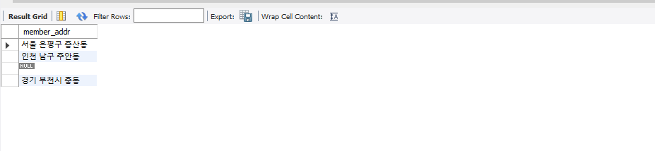 -DISTINCT는 조회는 결과에서 중복된 데이터를 1개만 남김. 여기서는 회원들의 지역(addr)을 출력해봄