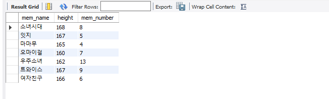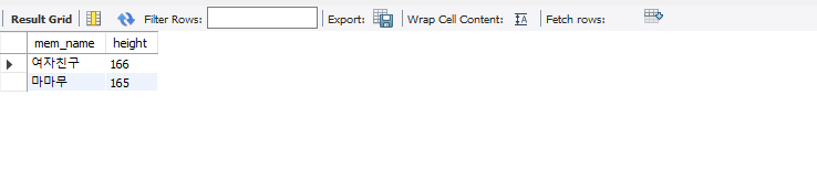-숫자로 표현된 데이터는 범위를 지정할 수 있음. 예를 들어 평균 키(height)가 162 이하인 회원을 검색하려면 다음과 같이 관계 연산자 <= (작거나 같다)를 사용해서 조회할 수 있음