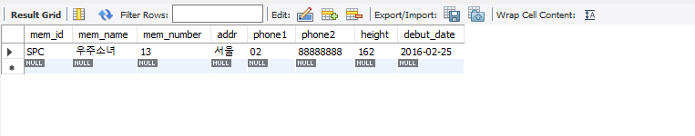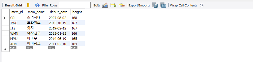 | INSERT INTO member VALUES('TWC', '트와이스', 9, '서울', '02', '11111111', 167, '2015.10.19'); INSERT INTO member VALUES('BLK', '블랙핑크', 4, '경남', '055', '22222222', 163, '2016.08.08'); INSERT INTO member VALUES('WMN', '여자친구', 6, '경기', '031', '33333333', 166, '2015.01.15'); INSERT INTO member VALUES('OMY', '오마이걸', 7, '서울', NULL, NULL, 160, '2015.04.21'); INSERT INTO member VALUES('GRL', '소녀시대', 8, '서울', '02', '44444444', 168, '2007.08.02'); INSERT INTO member VALUES('ITZ', '잇지', 5, '경남', NULL, NULL, 167, '2019.02.12'); INSERT INTO member VALUES('RED', '레드벨벳', 4, '경북', '054', '55555555', 161, '2014.08.01'); INSERT INTO member VALUES('APN', '에이핑크', 6, '경기', '031', '77777777', 164, '2011.02.10'); INSERT INTO member VALUES('SPC', '우주소녀', 13, '서울', '02', '88888888', 162, '2016.02.25'); INSERT INTO member VALUES('MMU', '마마무', 4, '전남', '061', '99999999', 165, '2014.06.19'); INSERT INTO buy VALUES(NULL, 'BLK', '지갑', NULL, 30, 2); INSERT INTO buy VALUES(NULL, 'BLK', '맥북프로', '디지털', 1000, 1); INSERT INTO buy VALUES(NULL, 'APN', '아이폰', '디지털', 200, 1); INSERT INTO buy VALUES(NULL, 'MMU', '아이폰', '디지털', 200, 5); INSERT INTO buy VALUES(NULL, 'BLK', '청바지', '패션', 50, 3); INSERT INTO buy VALUES(NULL, 'MMU', '에어팟', '디지털', 80, 10); INSERT INTO buy VALUES(NULL, 'GRL', '혼공SQL', '서적', 15, 5); INSERT INTO buy VALUES(NULL, 'APN', '혼공SQL', '서적', 15, 2); INSERT INTO buy VALUES(NULL, 'APN', '청바지', '패션', 50, 1); INSERT INTO buy VALUES(NULL, 'MMU', '지갑', NULL, 30, 1); INSERT INTO buy VALUES(NULL, 'APN', '혼공SQL', '서적', 15, 1); INSERT INTO buy VALUES(NULL, 'MMU', '지갑', NULL, 30, 4); |