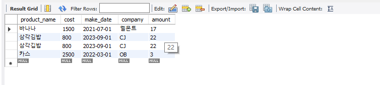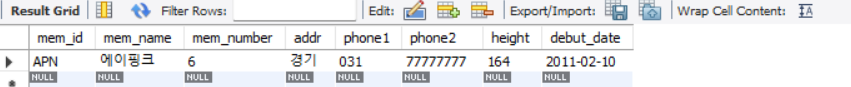 -구매 테이블(buy)의 첫 번째 열인 순번(num)은 자동으로 입력되므로 그 자리에서 NULL이라고 써주면 됨. 그러면 알아서 1, 2, 3, ... 으로 증가하면서 입력됨. 여기서는 처음이므로 1이 입력됨