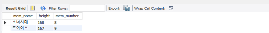 -2가지 이상의 조건을 만족하도록 할 수도 있음. 평균 키(height)가 165 이상이면서 인원(mem_number)도 6명 초과인 회원은 다음과 같이 논리 연산자 AND를 이용해서 조회할 수 있음