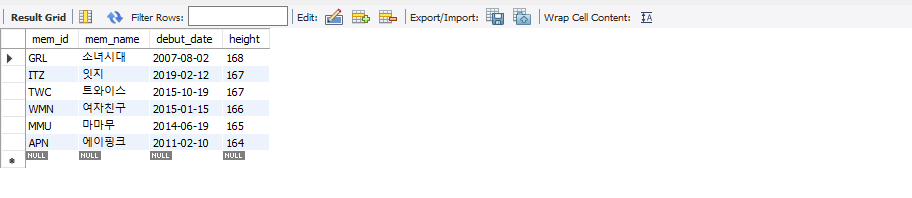 *열 이름에 별칭(alias)을 지정할 수 있음. 열 이름 다음에 지정하고 싶은 별칭을 입력하면 됨. 별칭에 공백이 있으면 큰따옴표(")로 묶어줌 ex) SELECT debut_date "데뷔 일자" FROM member;