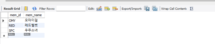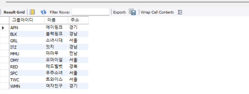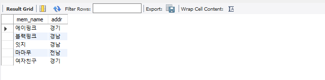 | select mem_id "그룹아이디", mem_name 이름, addr '주소' from member; |