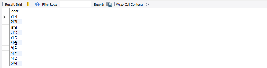 -다음 SQL의 결과를 보면 회원이 사는 지역(addr)은 경기, 경남, 서울, 전남, 경북 등 5군데인 것을 확인할 수 있음. 데이터가 적은데도 중복된 것을 눈으로 골라내기 힘듬